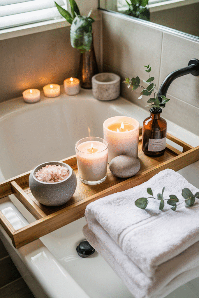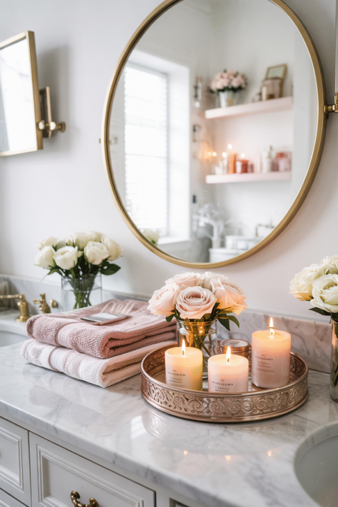 If you want a quick upgrade, bathroom tray styling is one of the easiest decor wins. A simple tray on the vanity with candles, soap, and perfume can completely transform the visual appeal. It’s affordable, highly Pinterestable, and perfect for content creation.