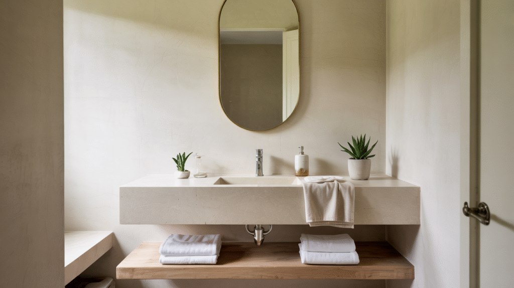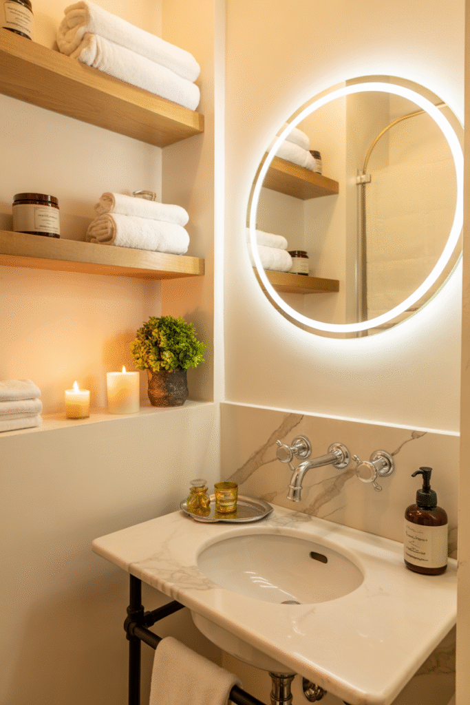 A statement bathroom mirror decor piece can also make a dramatic difference. Round mirrors with LED lights are extremely popular in contemporary interiors, while ornate gold mirrors pair beautifully with luxury bathroom decor. If you’re updating a powder room, guest bathroom decor ideas such as stylish mirrors, fresh towels, and decorative soap trays help create a welcoming experience.