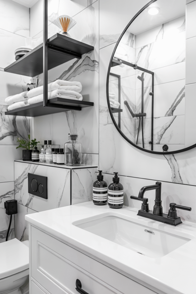 Budget-conscious decorators can still achieve stunning results with a budget bathroom makeover. Replace old towels, upgrade your mirror, add peel-and-stick wallpaper, style shelves, and refresh hardware. These small updates deliver big visual impact without spending too much.