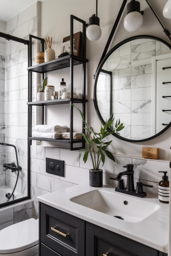 Storage styling is another huge ranking topic, especially for bathroom shelf decor. Use open shelves to display folded towels, scented candles, ceramic jars, and small plants. These simple touches create a designer feel while improving functionality. If you want more visual appeal, try DIY bathroom shelf decor ideas by painting wooden shelves in warm oak or matte black.