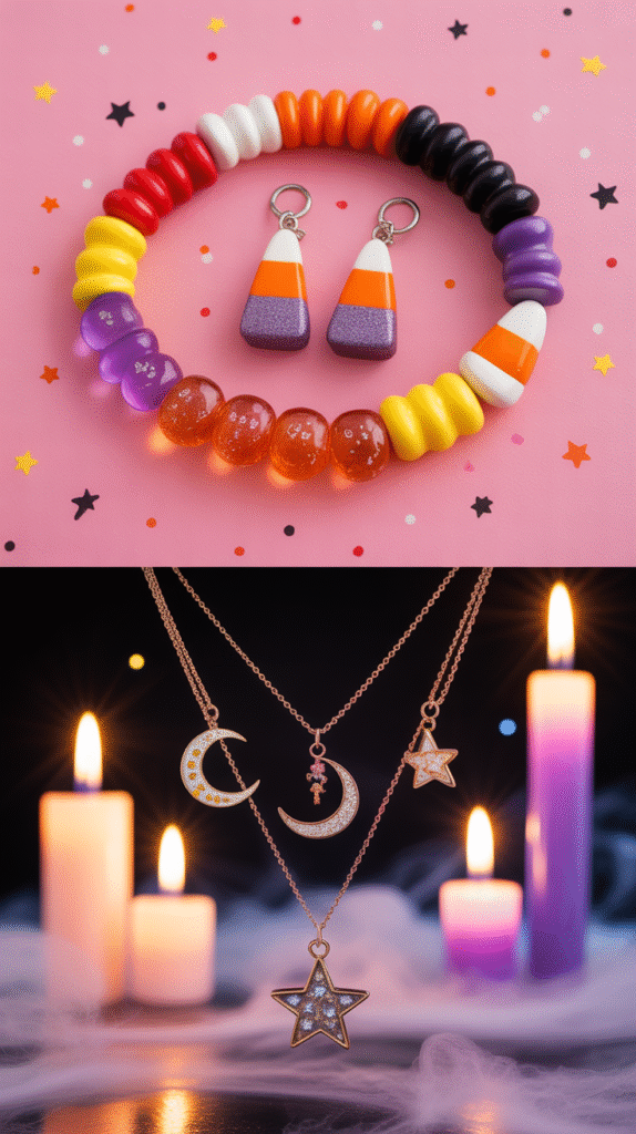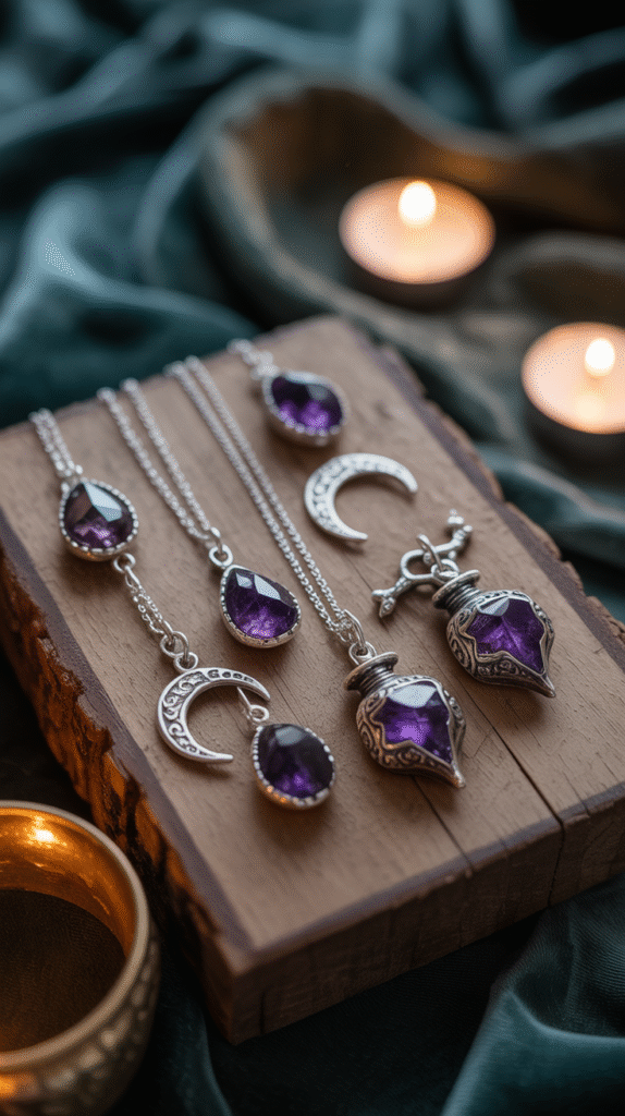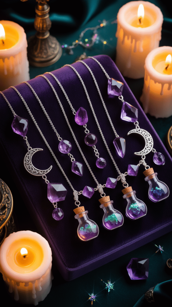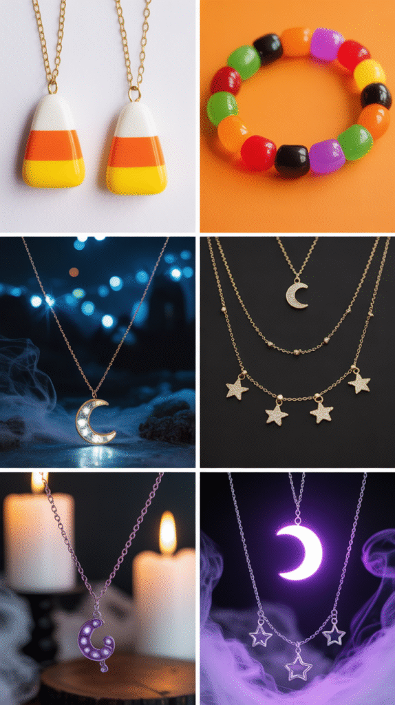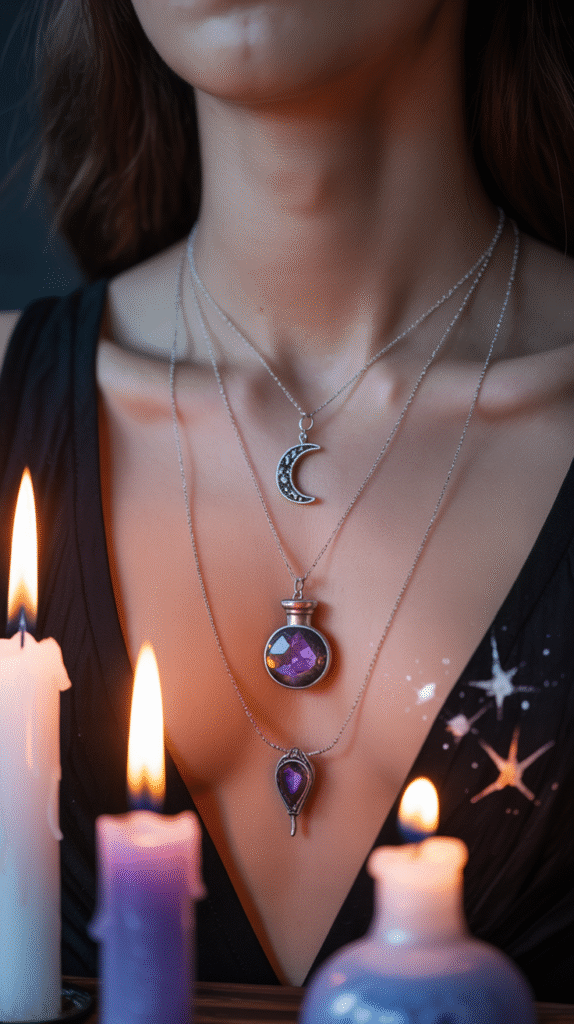 • Witch: choose crescent moons, pentagram necklaces, or mystical stone rings.