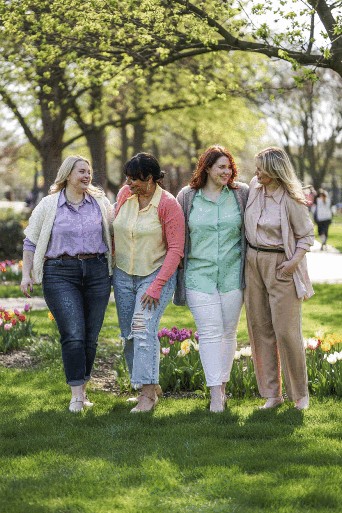 Layering is key for unpredictable spring weather. Incorporate spring plus size outfit ideas with jeans and plus size spring layering outfits. Denim jackets, light cardigans, and chic blazers can take your outfit from day to night seamlessly.