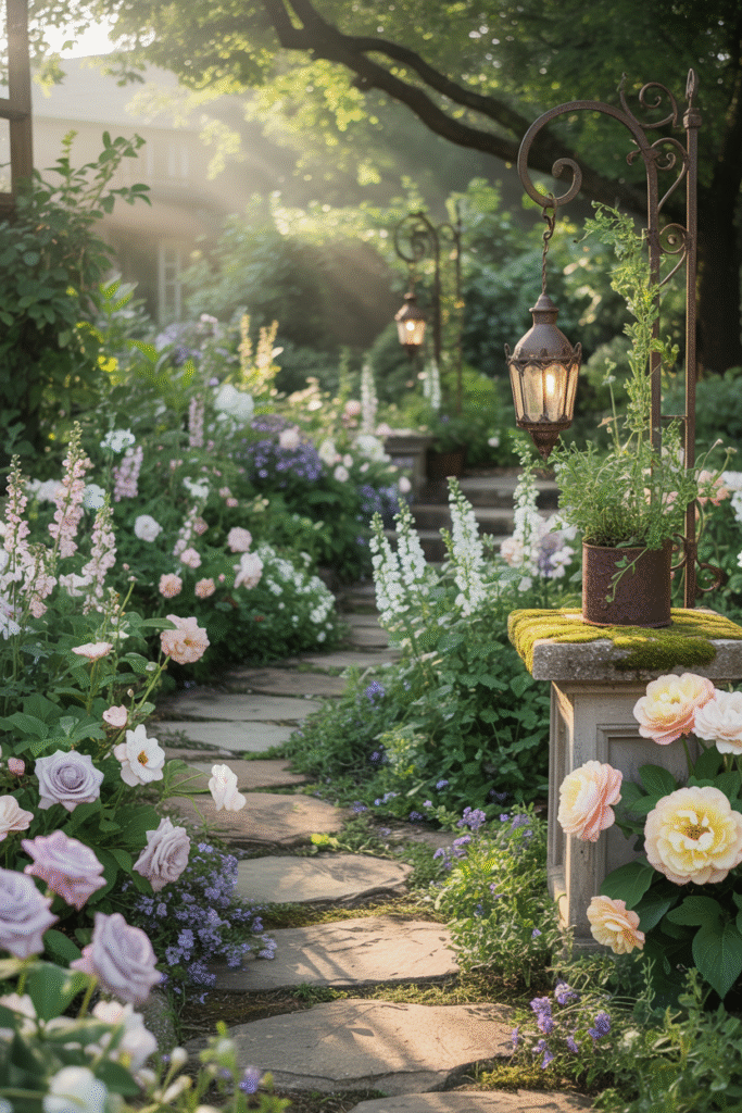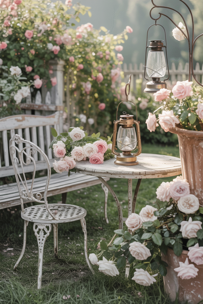Many people also love romantic vintage garden ideas that include roses, fairy lights, and vintage lanterns. These details create a dreamy and elegant outdoor atmosphere.